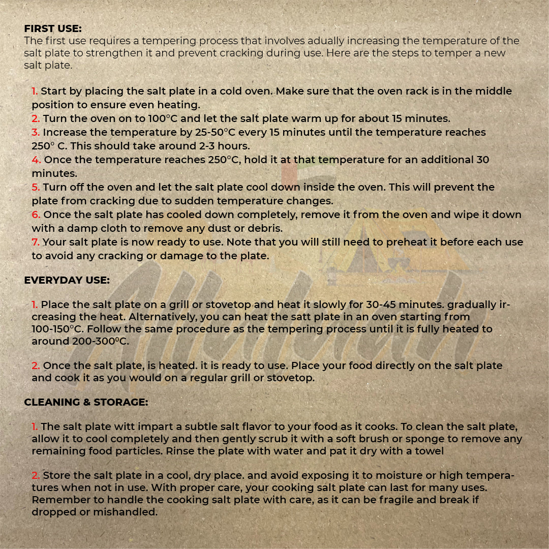 Perfect for grilling meats, seafood, or vegetables, the salt plate withstands high temperatures and evenly distributes heat for a perfect sear. Use it directly on the BBQ, stovetop, or even chill it to serve cold appetizers like sushi or cheese.